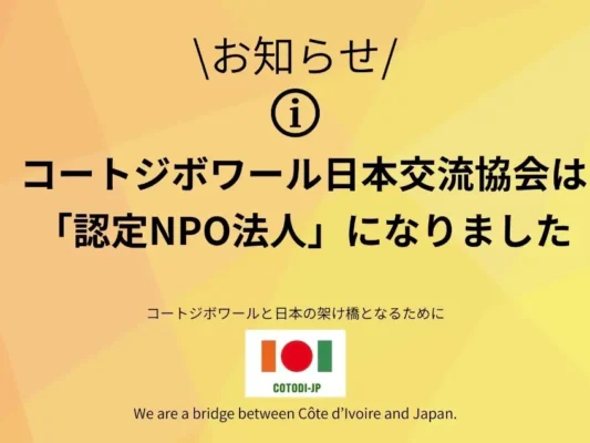 コートジボワール日本交流協会、東京都より「認定NPO法人」として認定を取得皆様のご支援が税控除の対象になります …